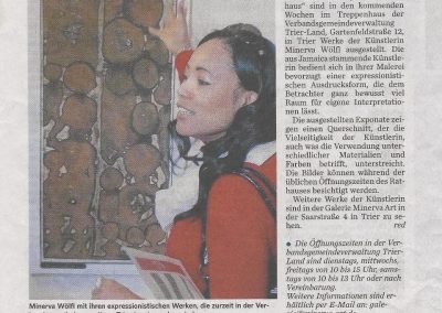 Ich lasse mich in den verschiedensten Situationen inspirieren. Besonders beeinflussen mich Farben, Formen und Klänge aus der Natur, aber auch die Musik, die Menschen und Tiere. Um meine Techniken zu vertiefen, habe ich die Kunstakademie in Trier besucht und verschiedene Kurse belegt, doch hauptsächlich eigne ich mir meine Fähigkeiten autodidaktisch an.